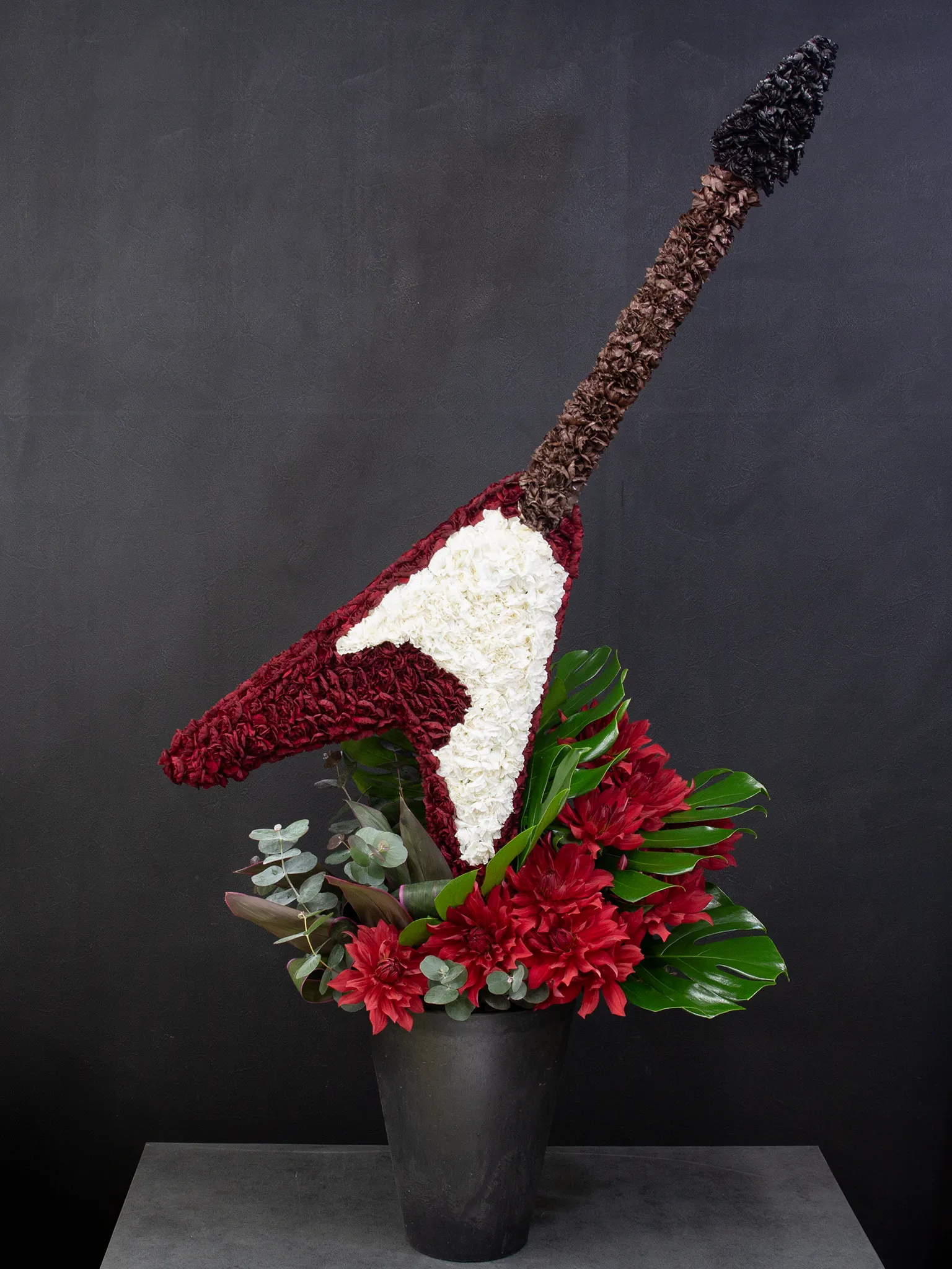 ギターの象徴的なシェイプを、鮮やかな植物の造形で再構築したフラワーオブジェ。 直線的で潔いアウトラインが、ミニマルな空間に凛とした緊張感と、確かな華やぎを添えてくれます。
