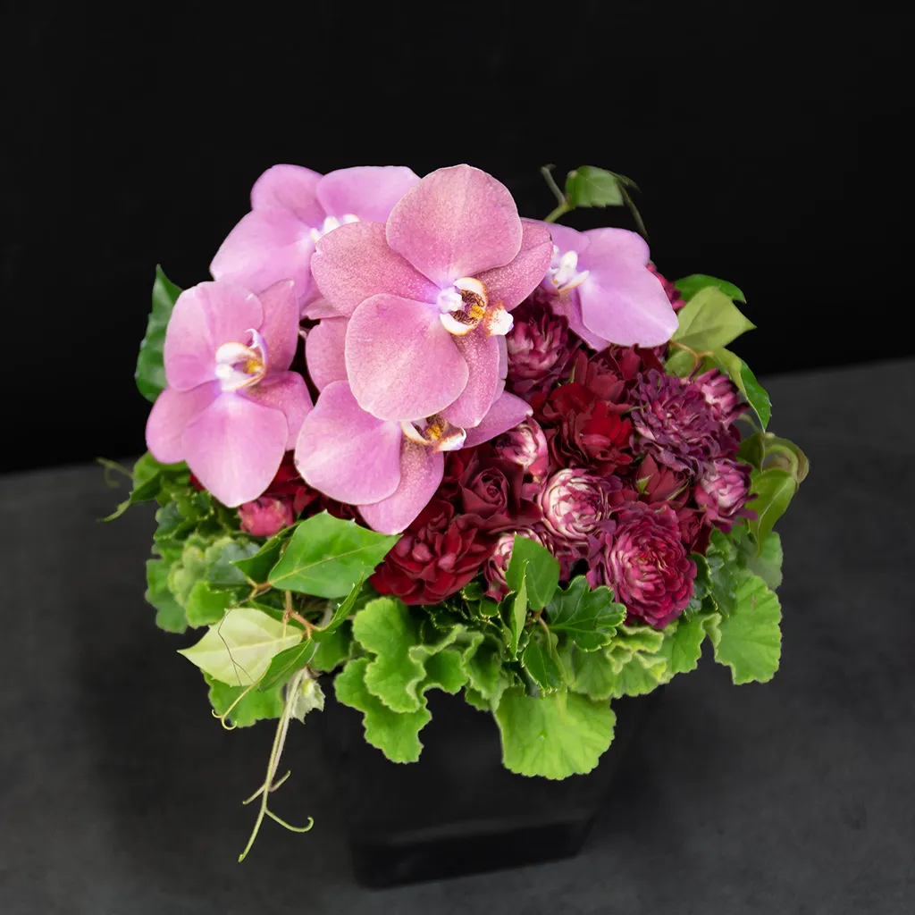 淡く優しい色合いの胡蝶蘭に、ボルドーやローズトーンの花々を合わせ、