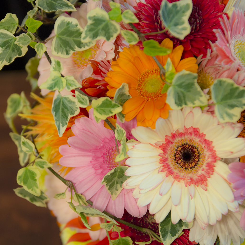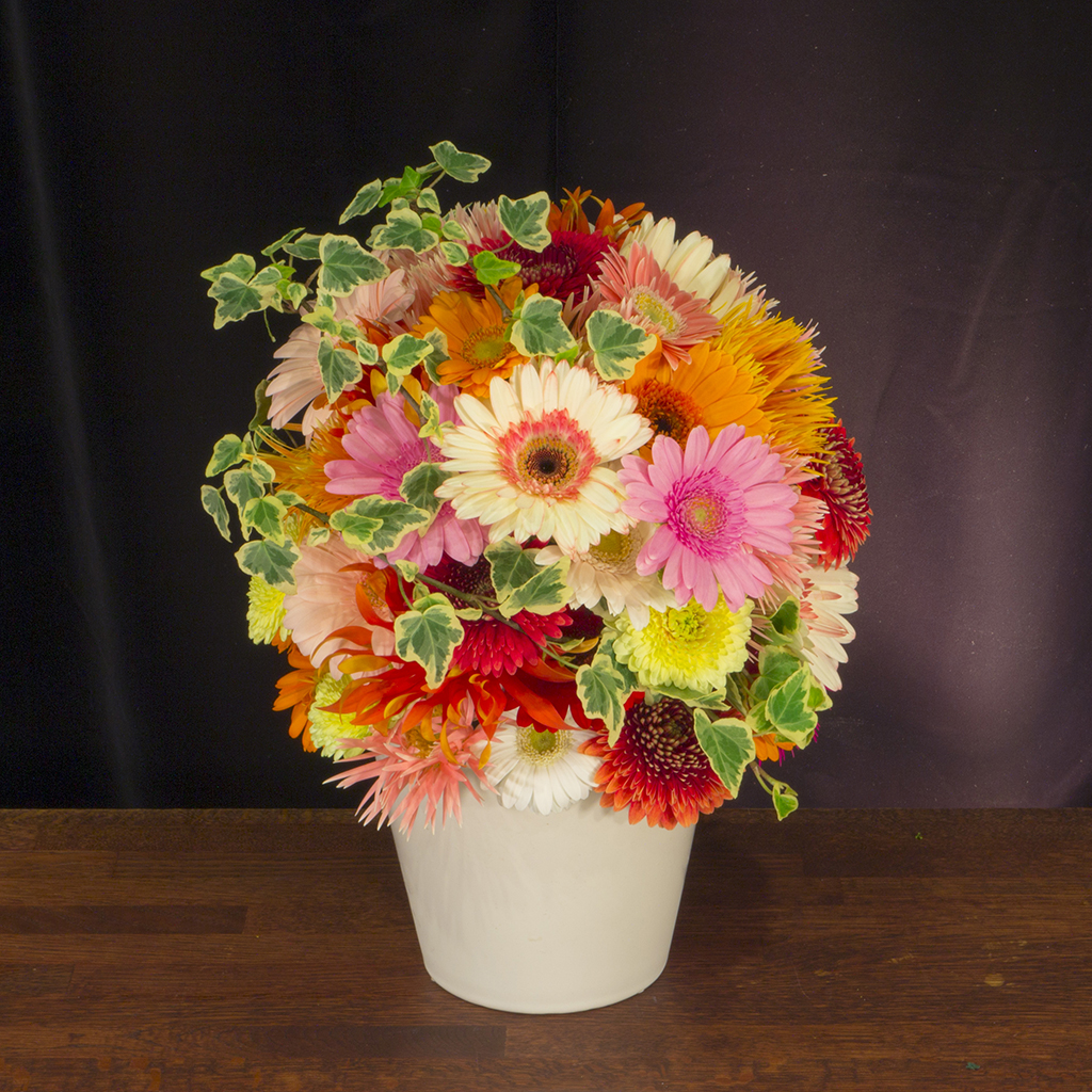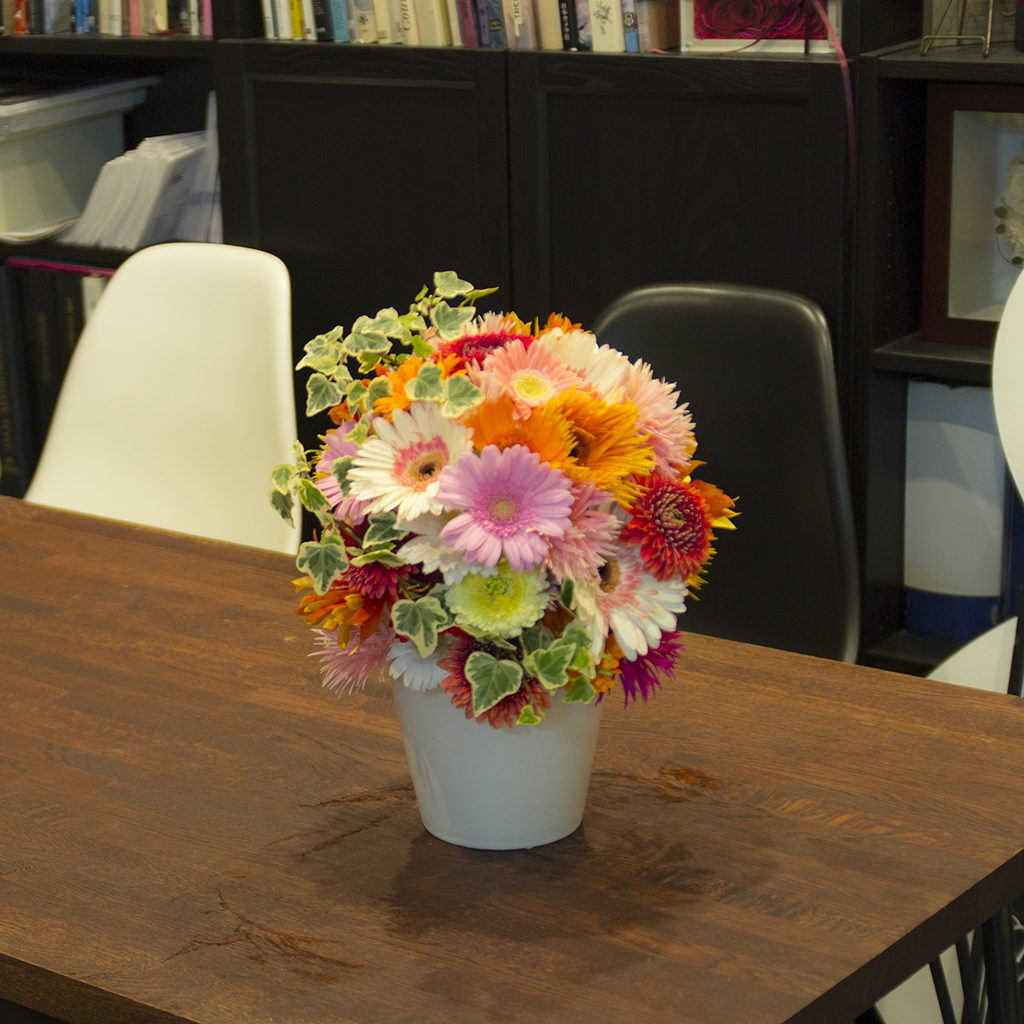色とりどりのガーベラをふんだんに使用した可愛いらしいアレンジメントです。