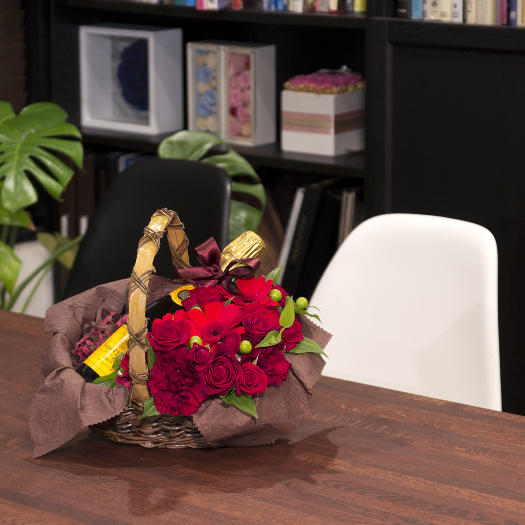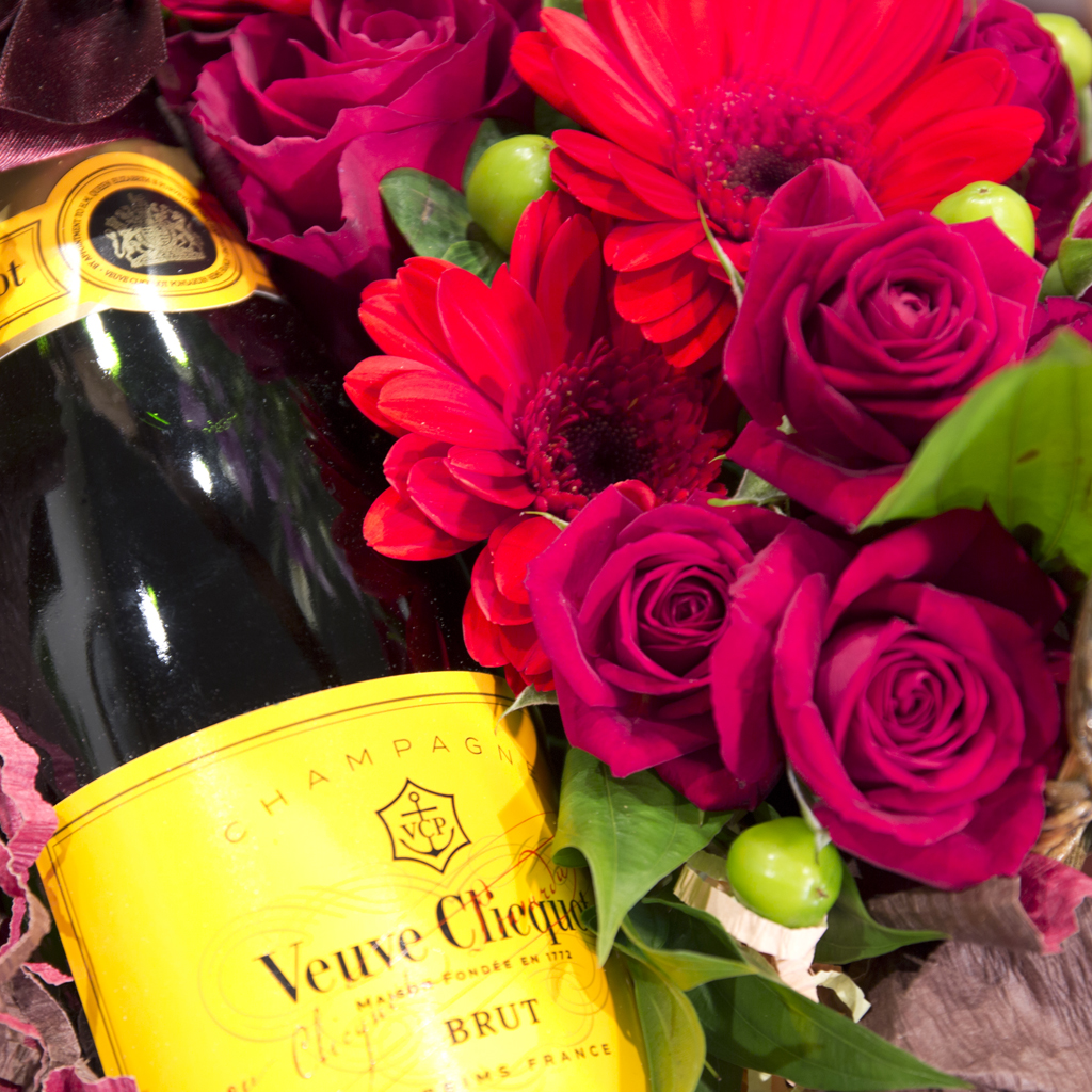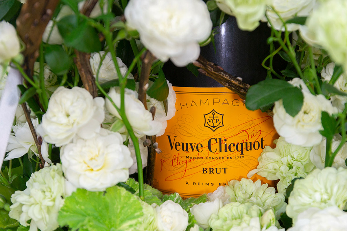 ハーフボトルサイズのシャンパン ヴーヴ・クリコと【季節のお花】がセットになった人気のバスケットフラワーアレンジメントです。