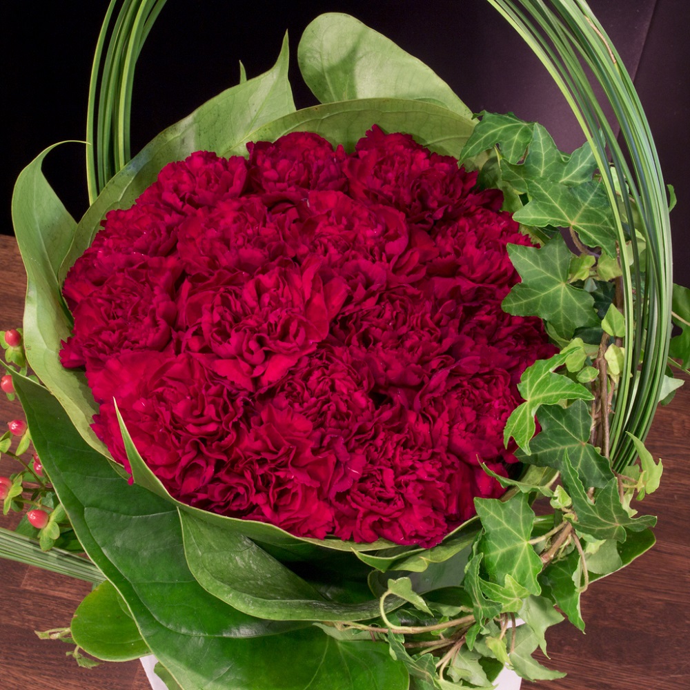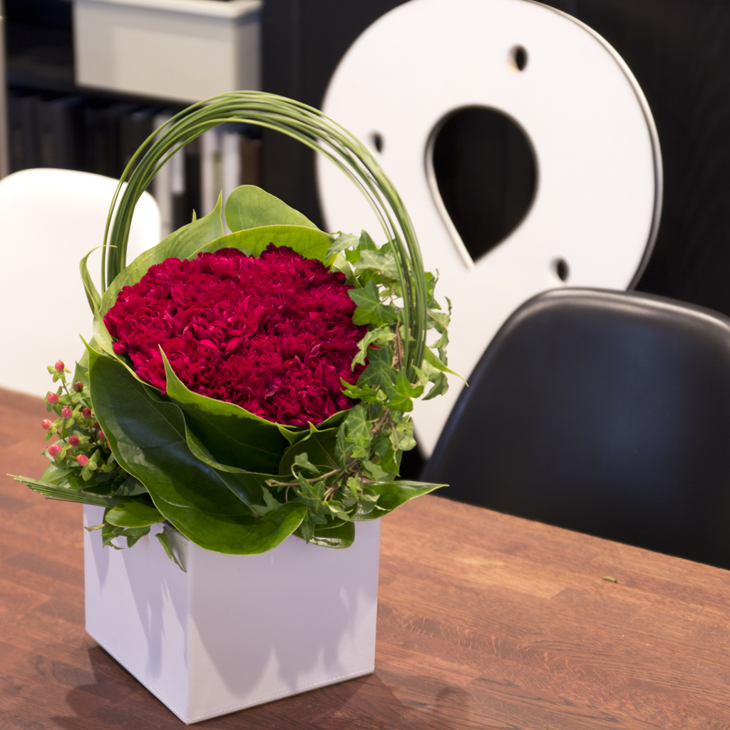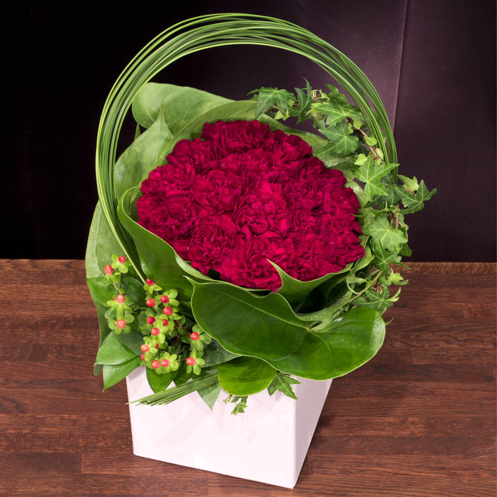 母の日定番の赤いカーネーションをスタイリッシュにデザインしたフラワーアレンジメントです。