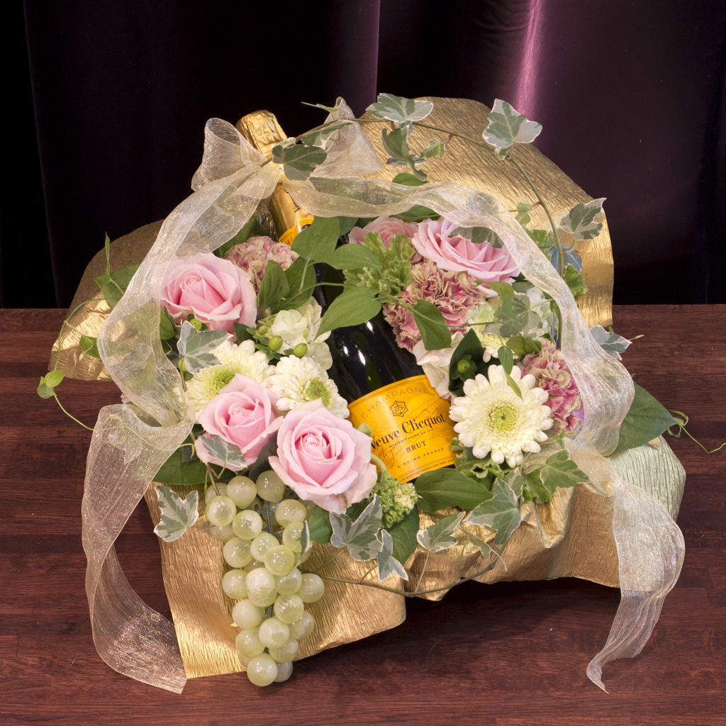 世界中のセレブレーションを彩るシャンパン「ヴーヴ・クリコ イエローラベル」のフルボトルを、溢れんばかりの花々と共に。 豊かな泡立ちを思わせる華やかなピンクローズとガーベラを添えた、圧倒的な存在感を放つプレミアムなギフトセットです。