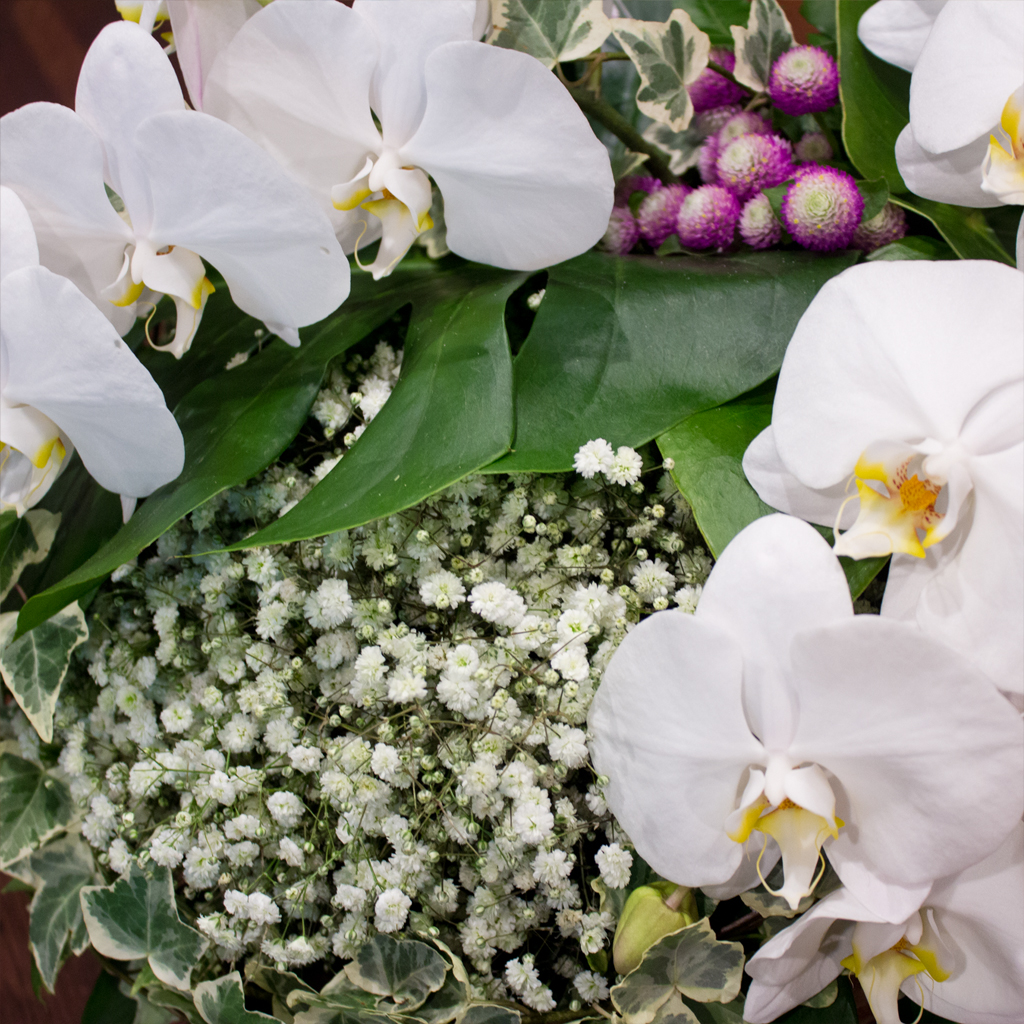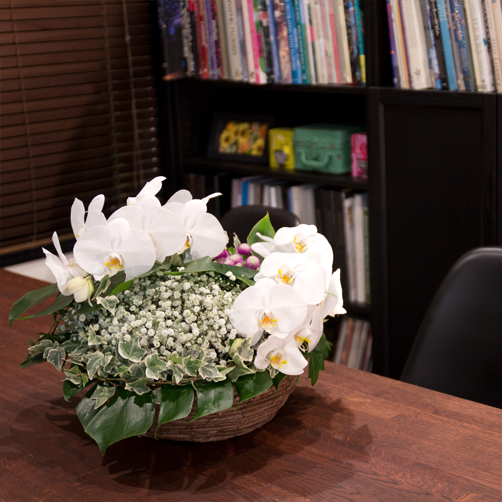 胡蝶蘭の下にはカスミソウの花畑。アレンジ次第でこんなにも表情が変わります。モダンでナチュラルなアレンジは様々な空間にマッチします。