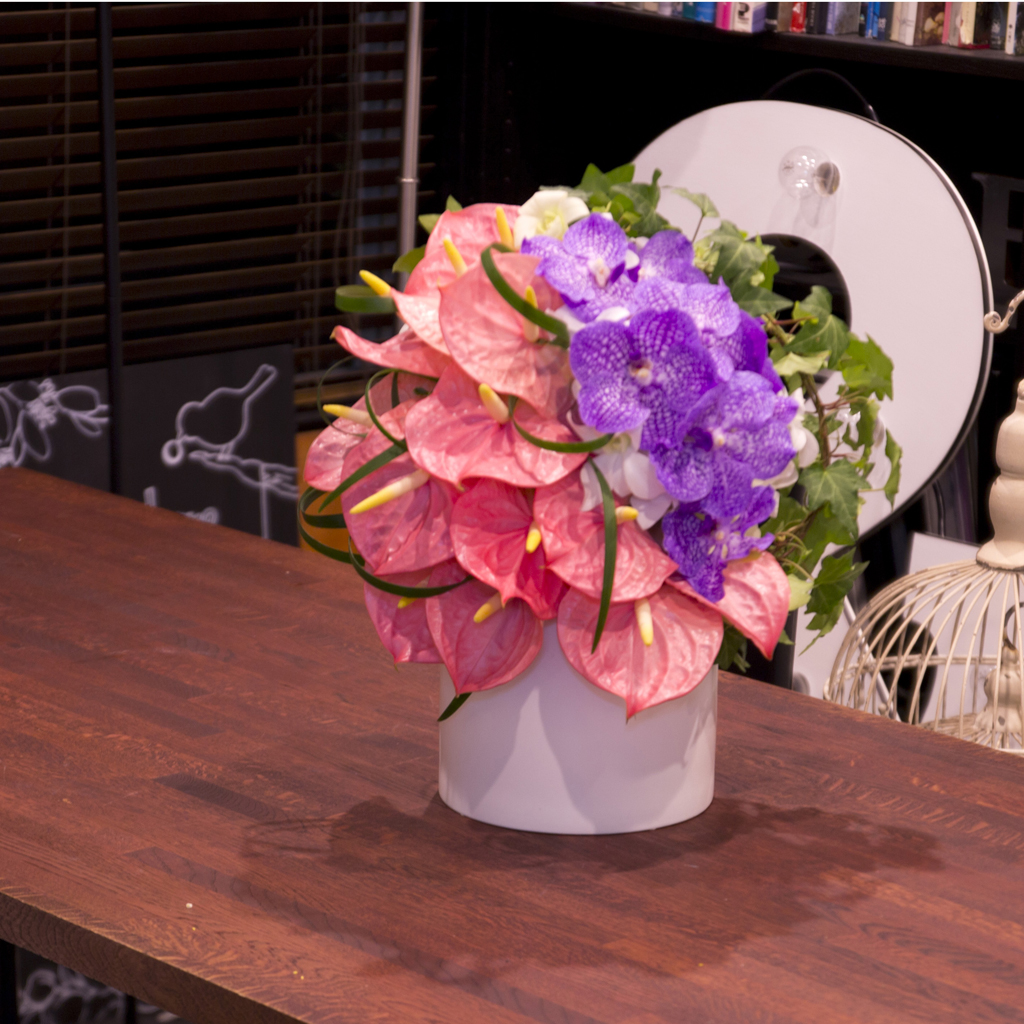 艶やかなピンクのアンスリウムと、深い紫が官能的なバンダ(蘭)。 相反する色彩が共鳴し合う「パッシィオーネ(情熱)」は、見え隠れする純白のデンファレと瑞々しいグリーンが調和を生む、洗練を極めたエキゾチック・モダンなアレンジメントです。