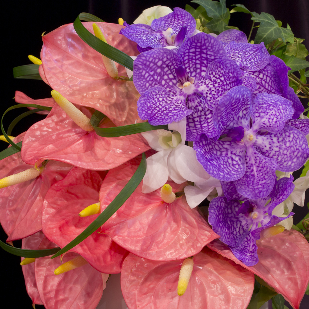 - アンスリウム(ピンク)、バンダ(パープル)、デンファレ(ホワイト)