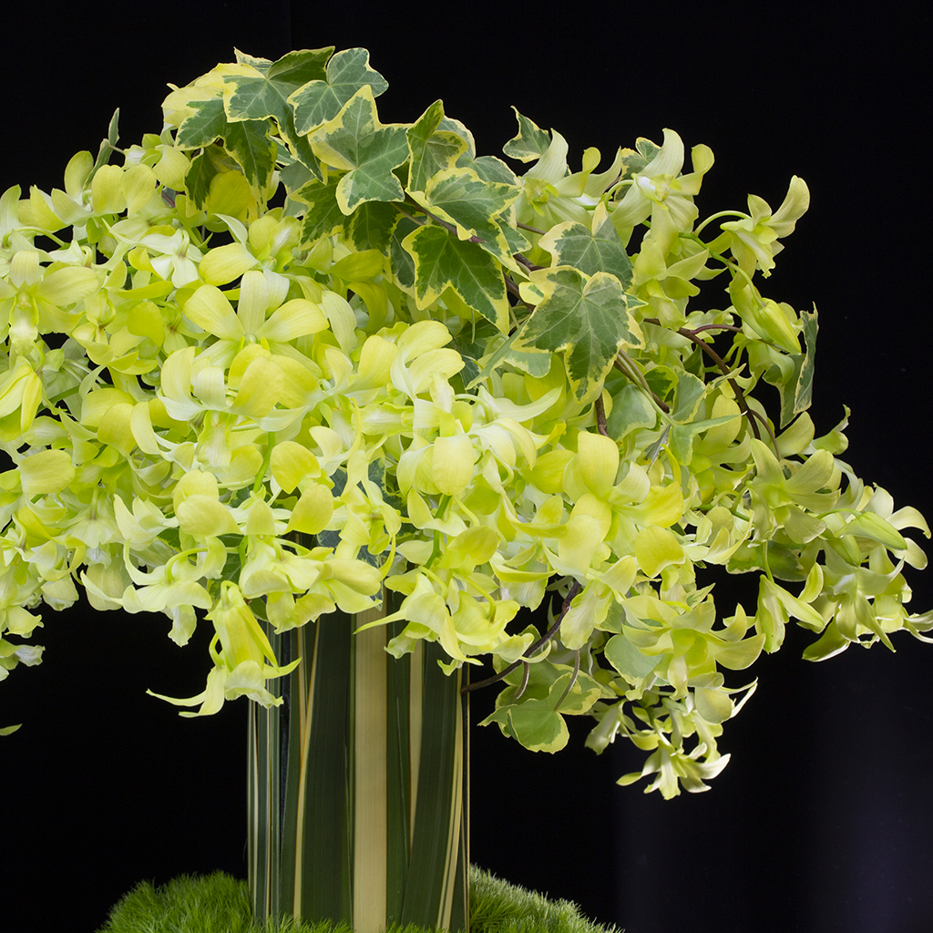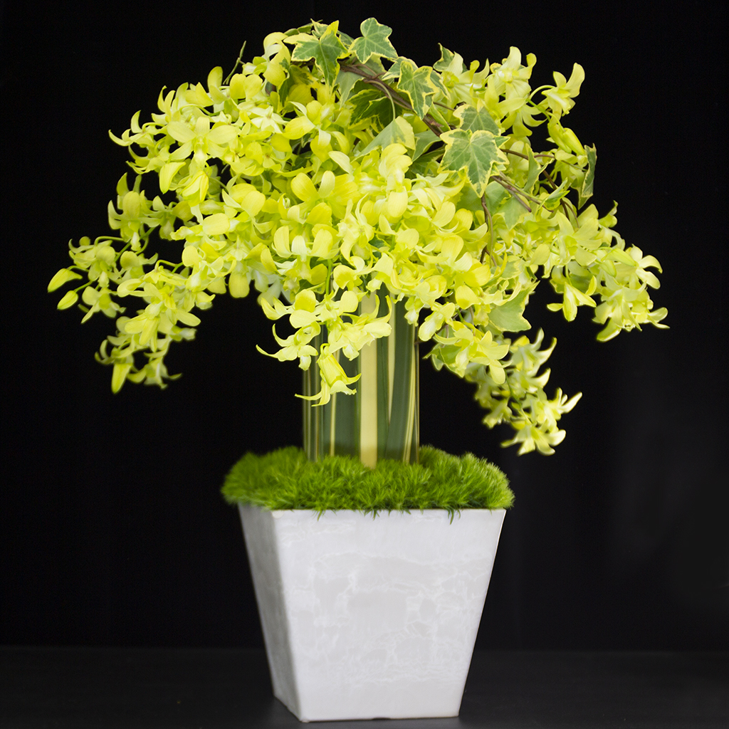 華やかな色合いのデンファレをふんだんに使用したフラワーアレンジメントです。