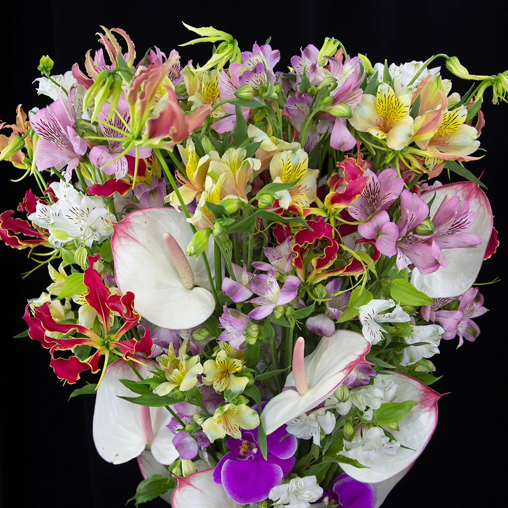 - 胡蝶蘭(濃ピンク)、グロリオサ(赤)、アルストロメリア(MIX)、アンスリウム(白系)