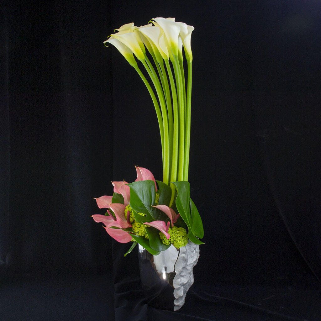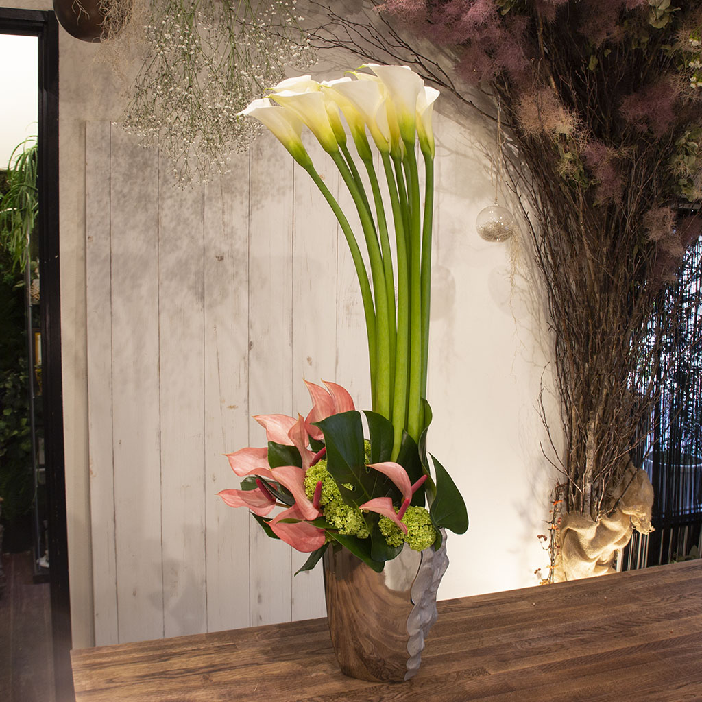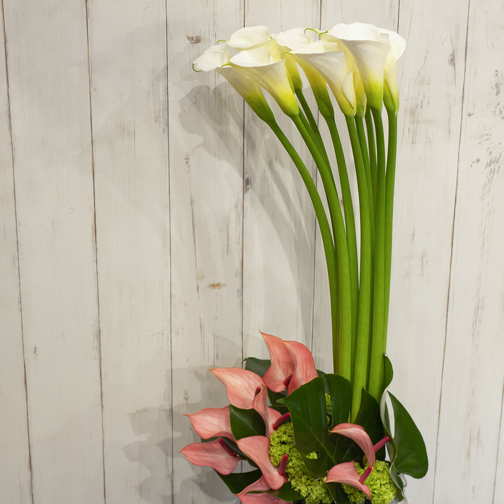 カラーとアンスリウムが美しい上品なフラワーアレンジメントです。