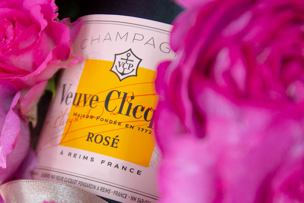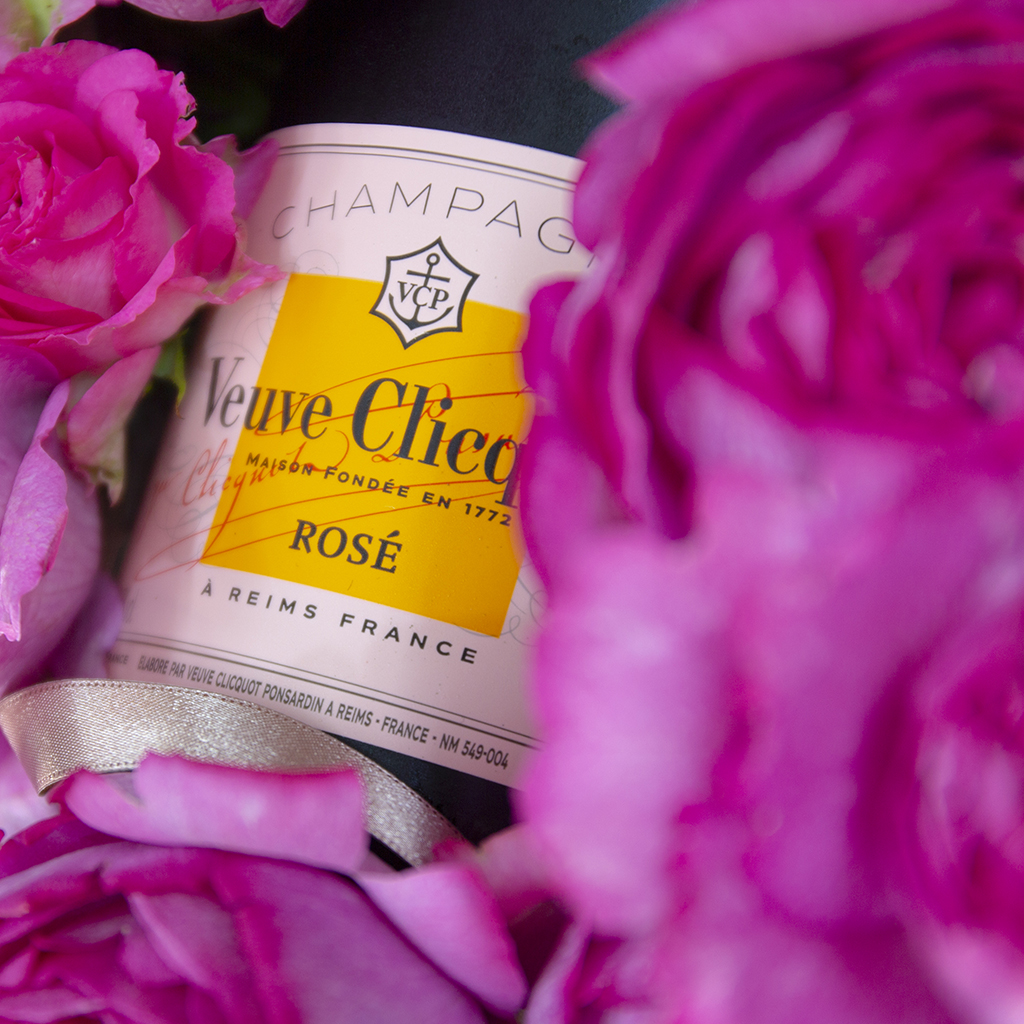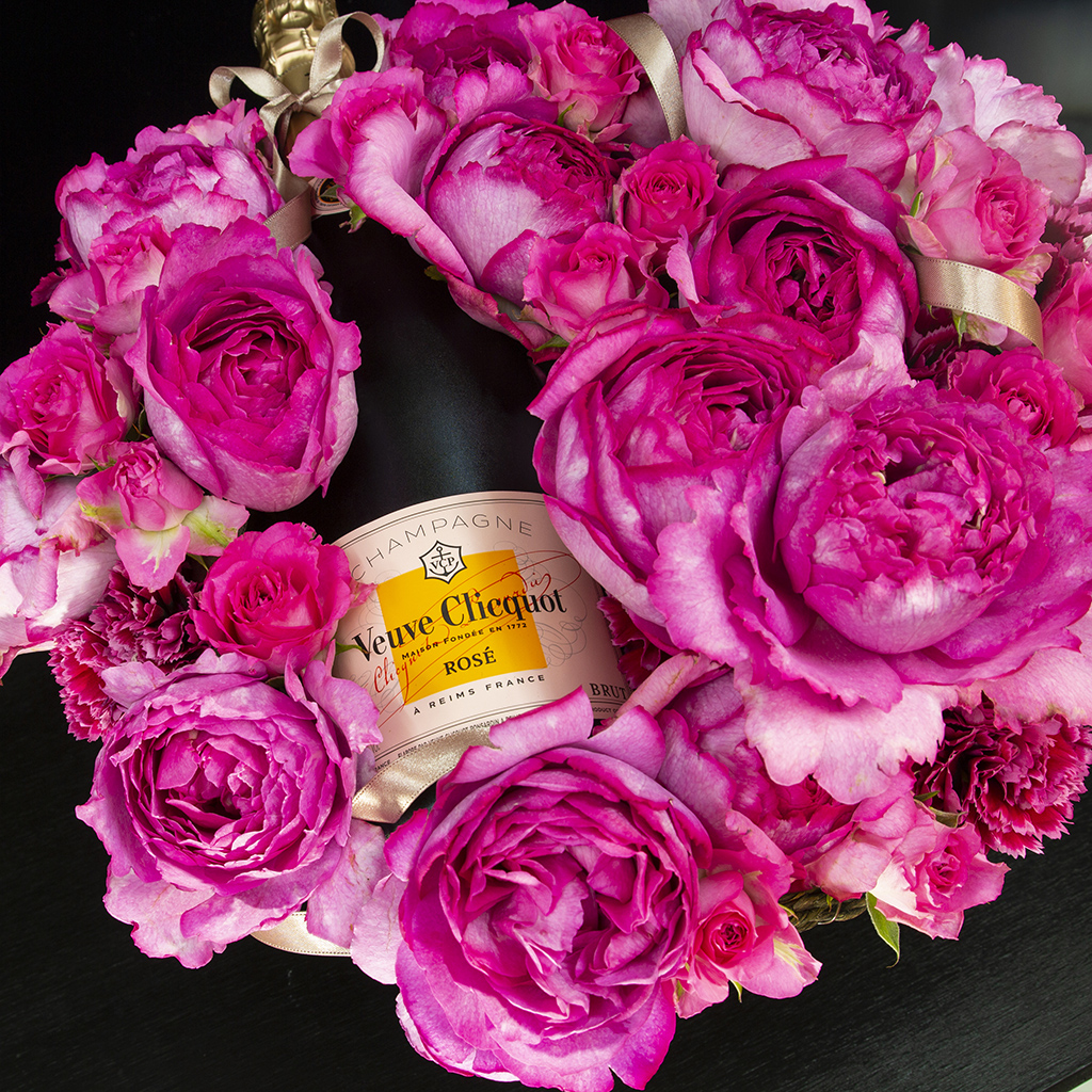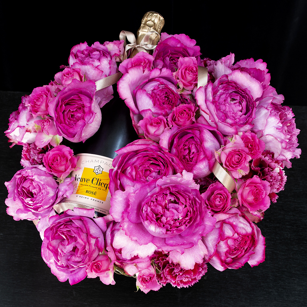 ヴーヴ・クリコ ローズラベル (フルボトル)とお花がセットになったフラワーアレンジメントです。