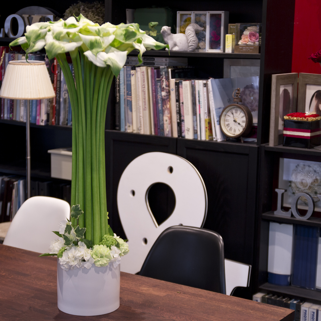 ※指定がない場合、アレンジメントは白背景、スタンド花・観葉植物等は木目背景にて仕立てます。