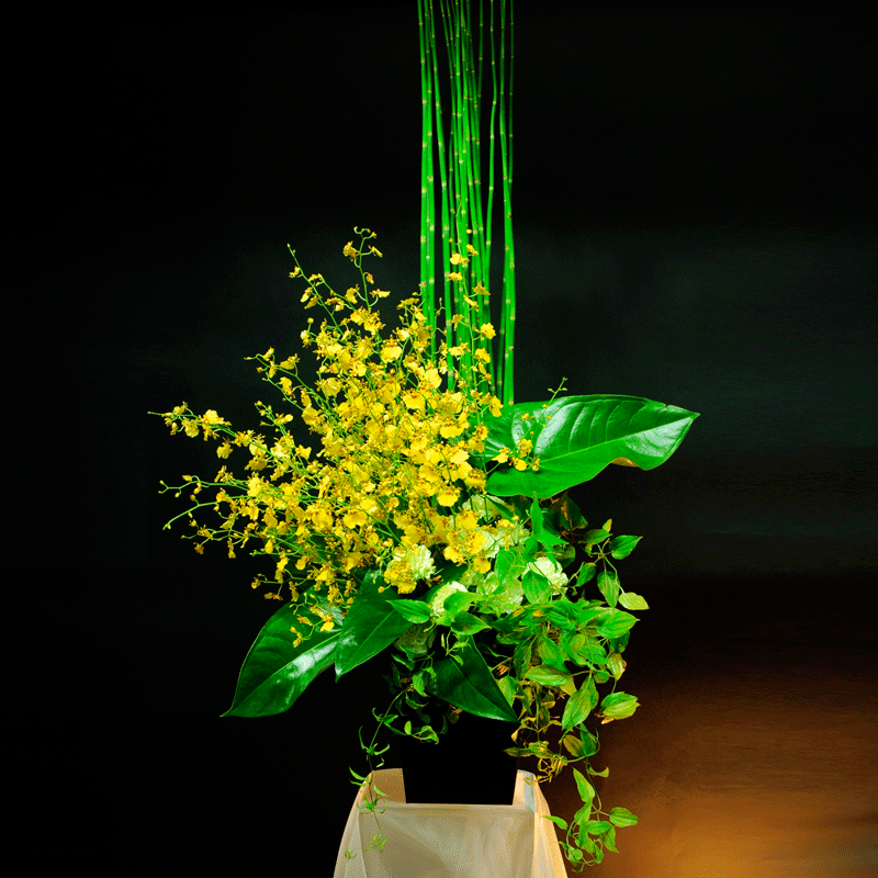 華やかさで人気の蘭「オンシジューム」をふんだんに使用し、おしゃれな葉物で魅せるデザイナーズフラワーです。