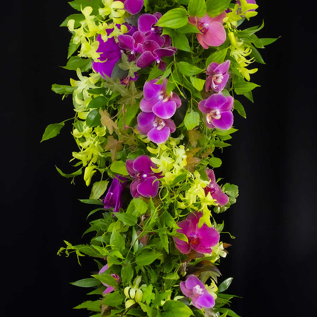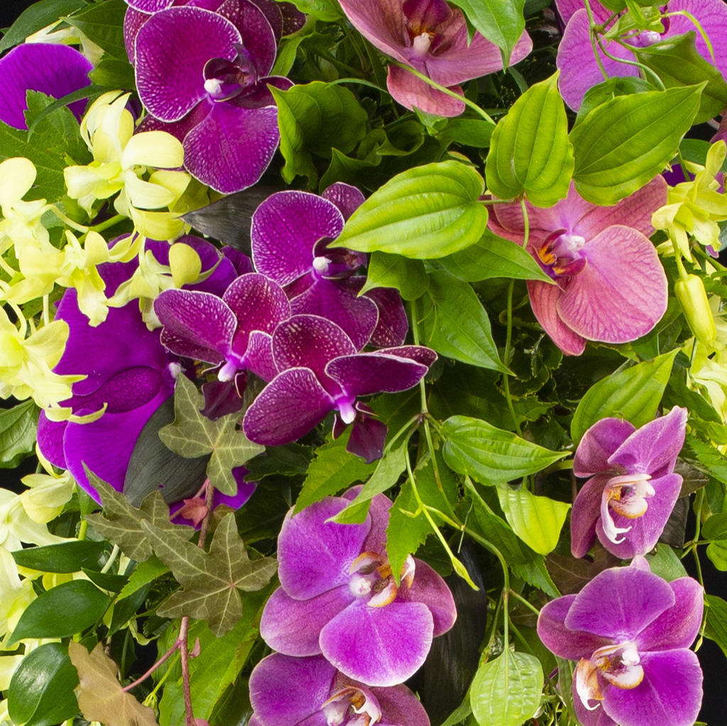 ランの花を全体に散りばめ、華やかでゴージャスな印象を与えます。