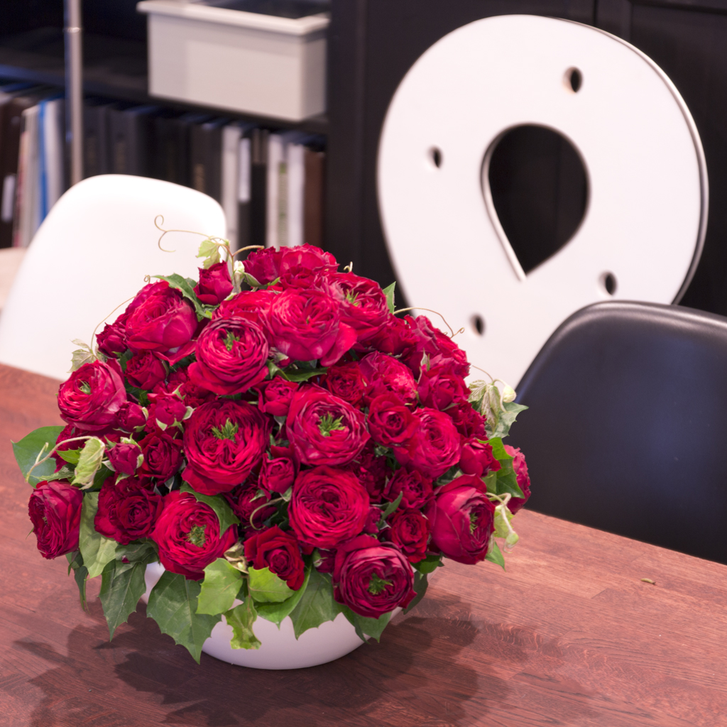 ※主役には、その時期もっとも美しい表情を見せる希少な「変わり咲き」の赤バラをデザイナーが厳選いたします。一輪ごとの豊かな巻きと、クラシカルな表情をお楽しみください。