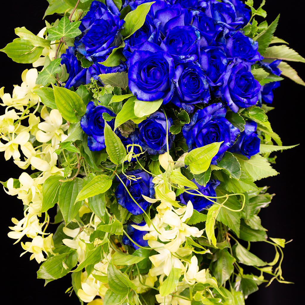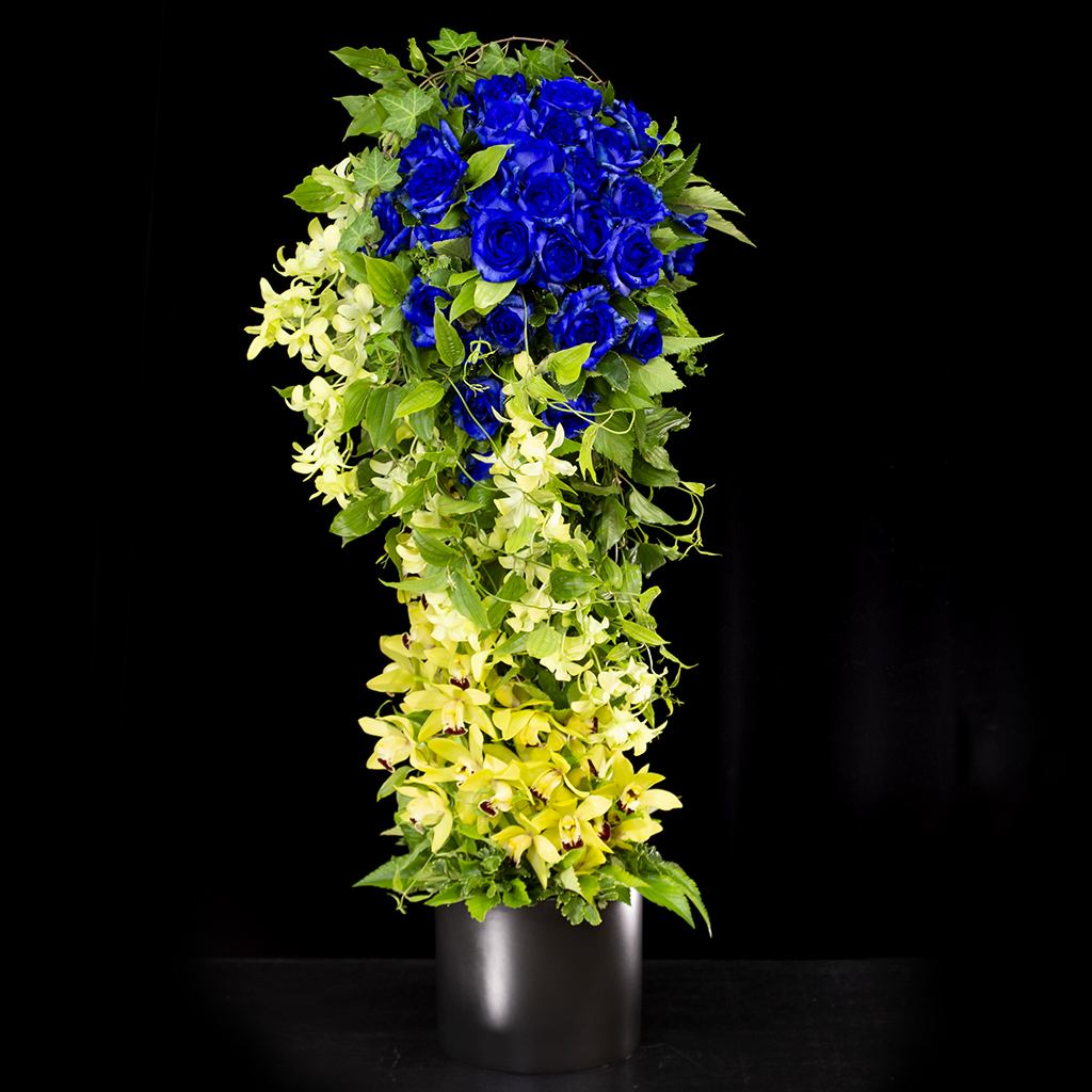 青い薔薇をメインに、グリーンの花や葉を使用し爽やかなイメージです。