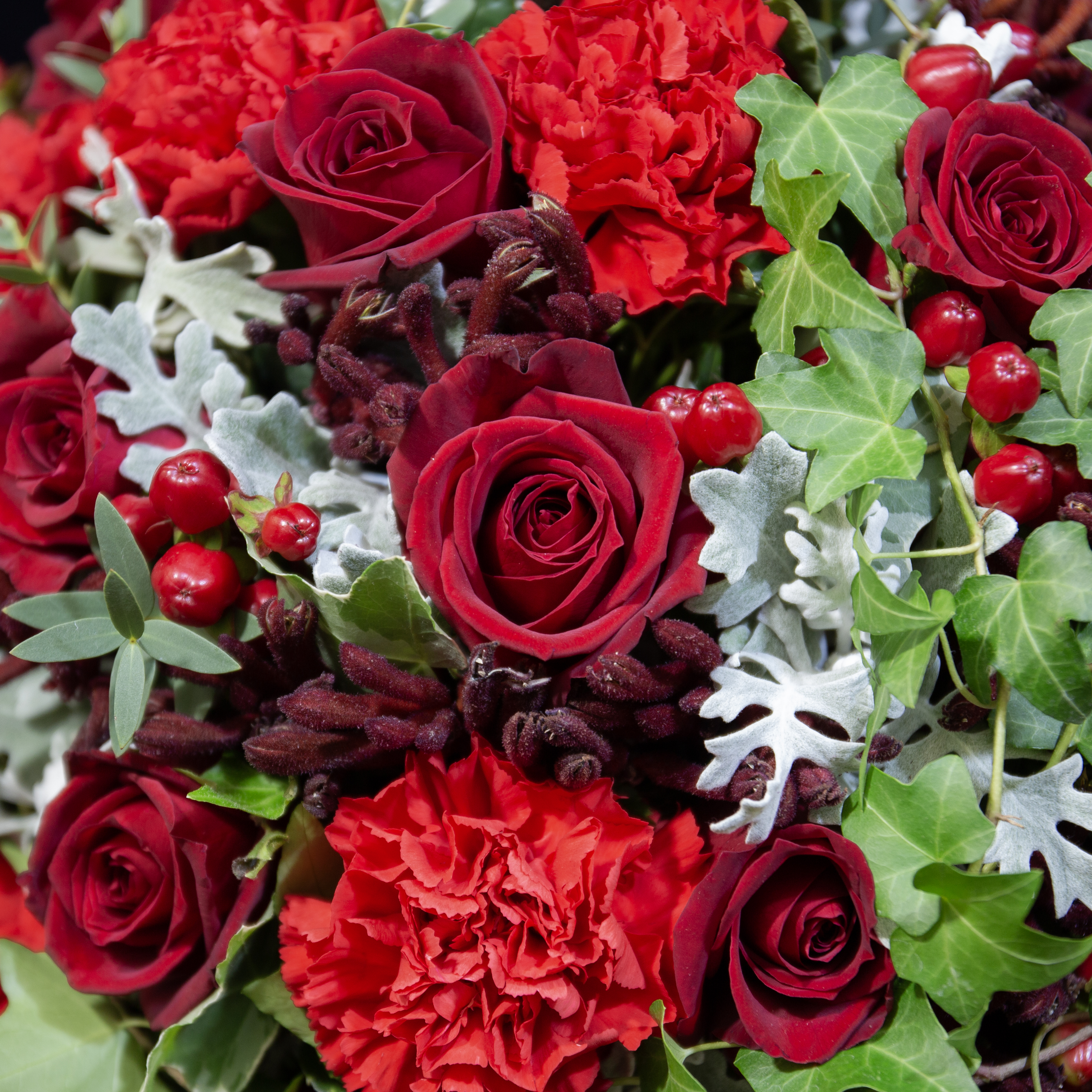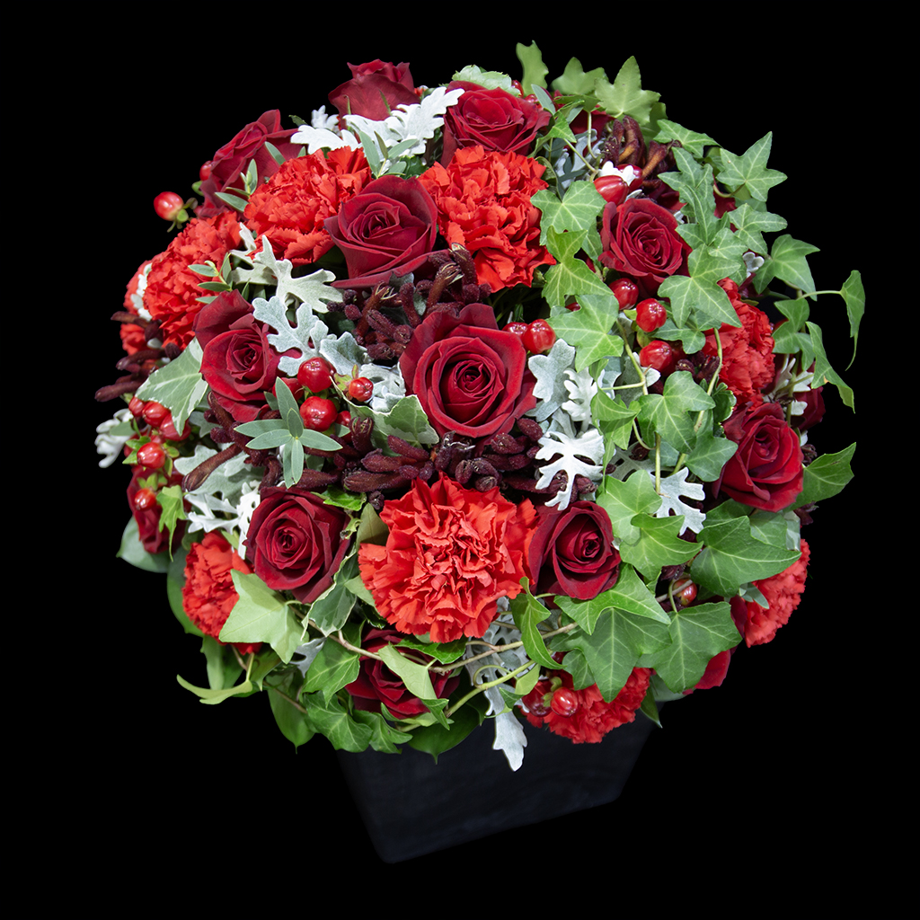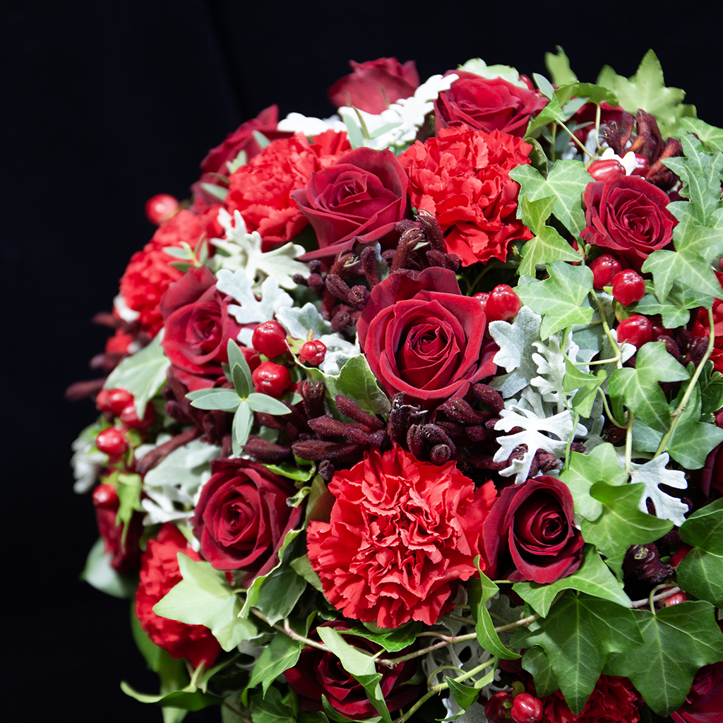 ※主役である赤の色彩が最も力強く輝くよう、その時期に最高の生命力を持つ花材をデザイナーが厳選いたします。