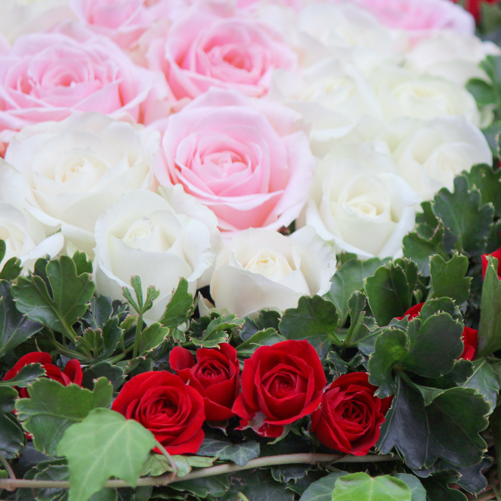 - バラ(白、ピンク、赤)、季節のグリーン