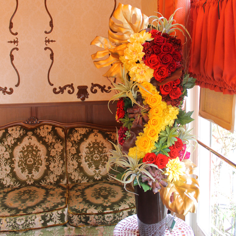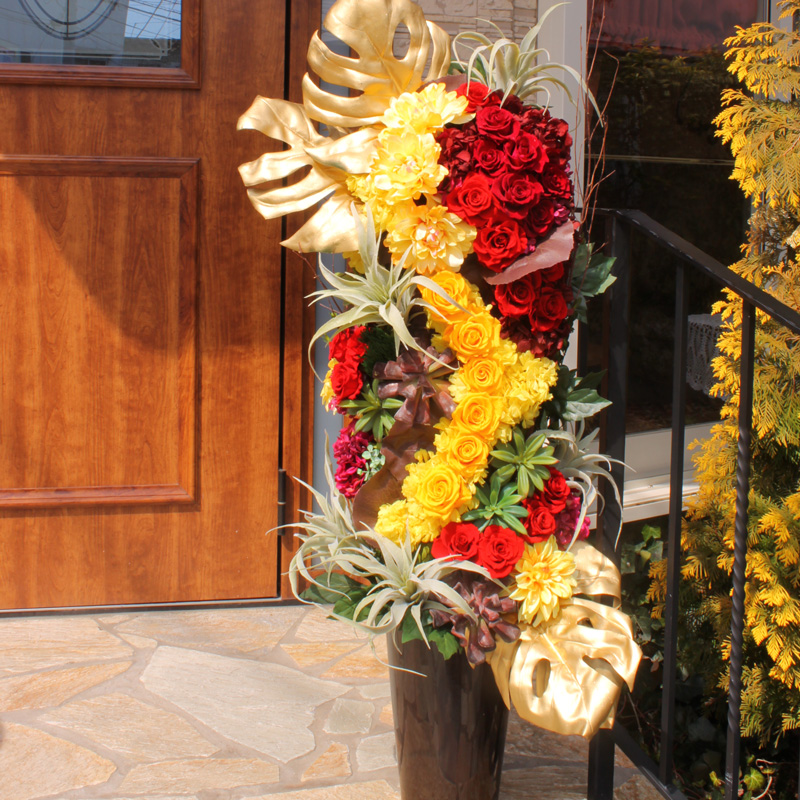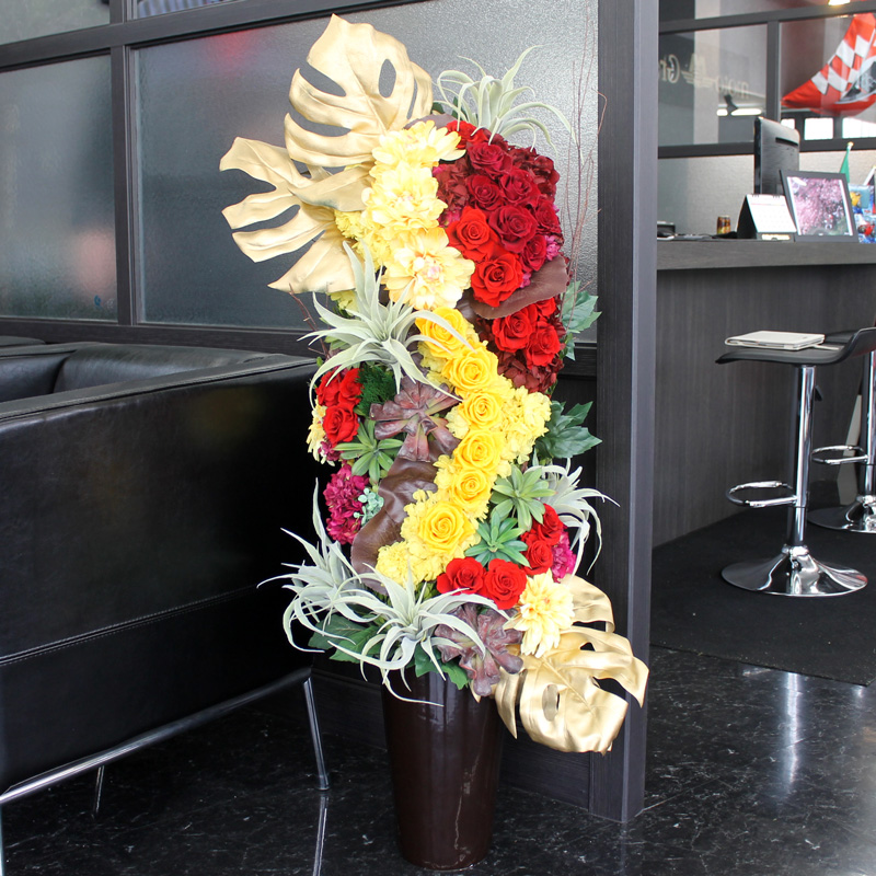 プリザーブドアレンジ「ALPHANFARE」は 黄色いバラのラインが特徴的なアジアンティストの フラワーオブジェです。 ビビッドイエローと、モダンレッドの組み合わせは とっても華やか!!一際目を引きます。 この「ALPANFARE」とは新たな始まり、新生を意味します。 ここぞという、SHOPや会社様の開業お祝としておすすめです。