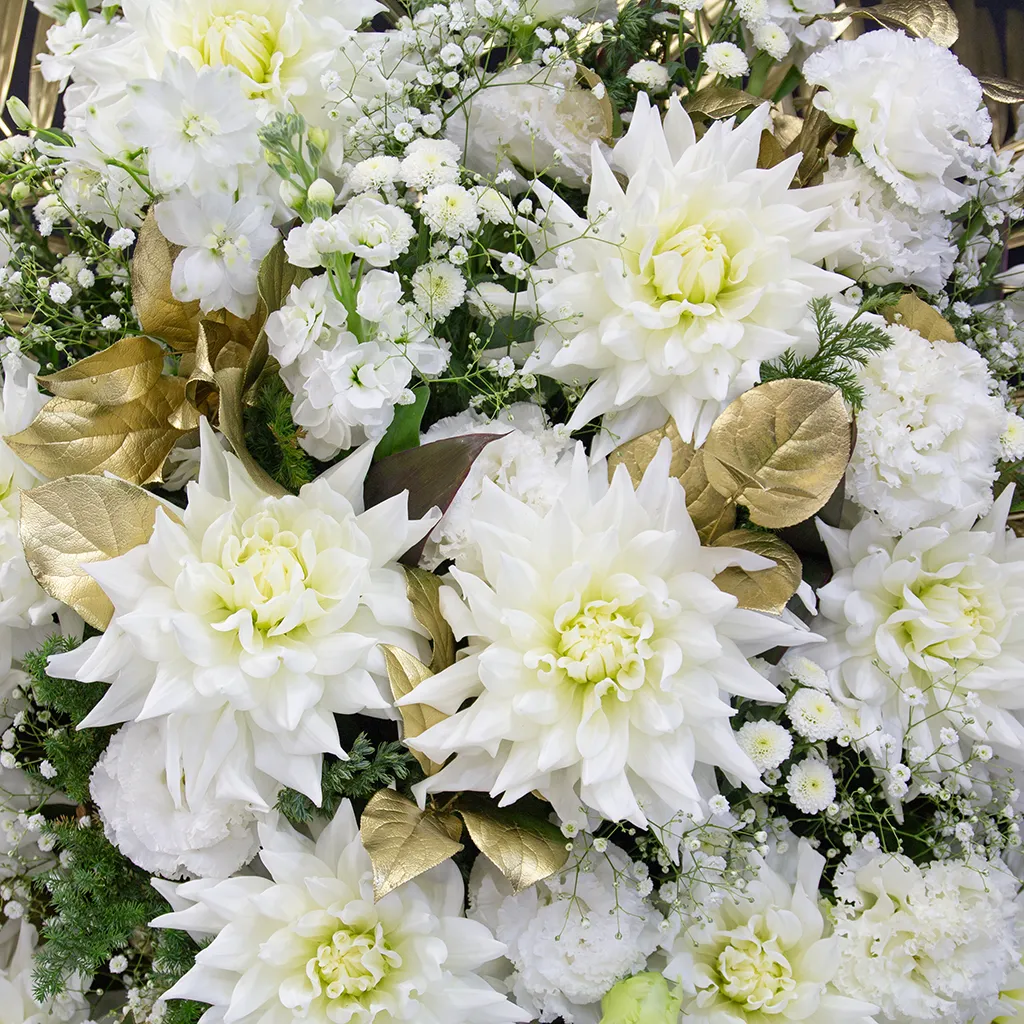 上質なホワイトを基調に、ゴールドのニュアンスを纏った花材を贅沢に使用し、静謐さと華やかさを兼ね備えた佇まいに仕上げました。