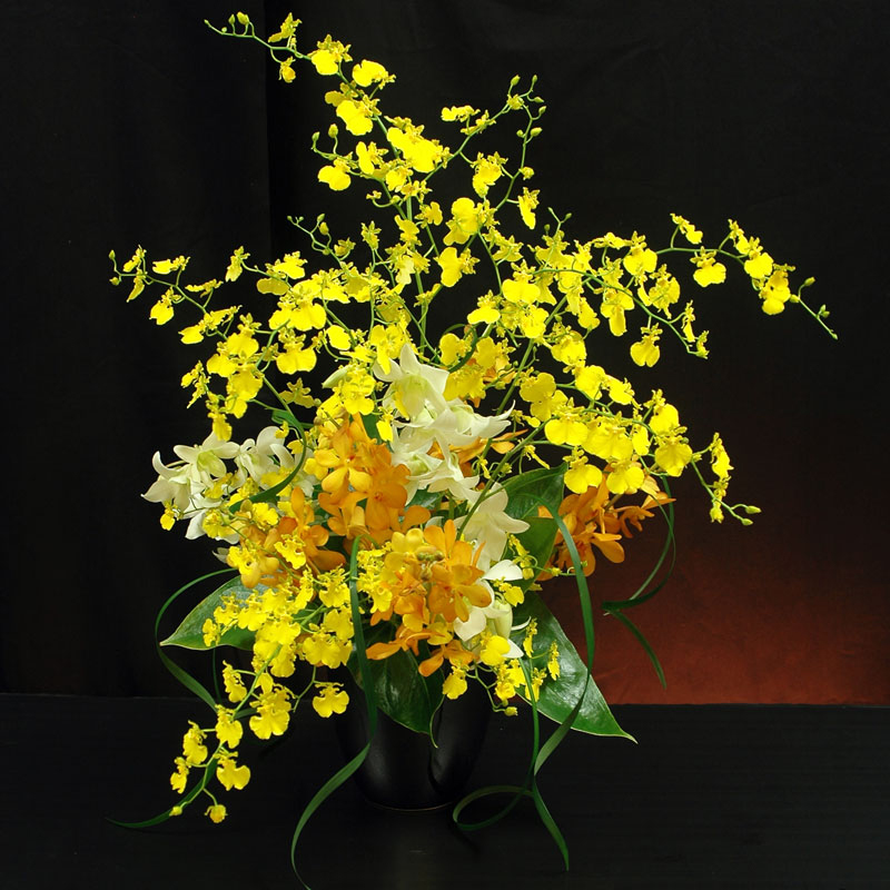 華やかな蘭が四方に舞います、その姿はお祝い事に相応しく、喜びと希望に満ちたアレンジです。