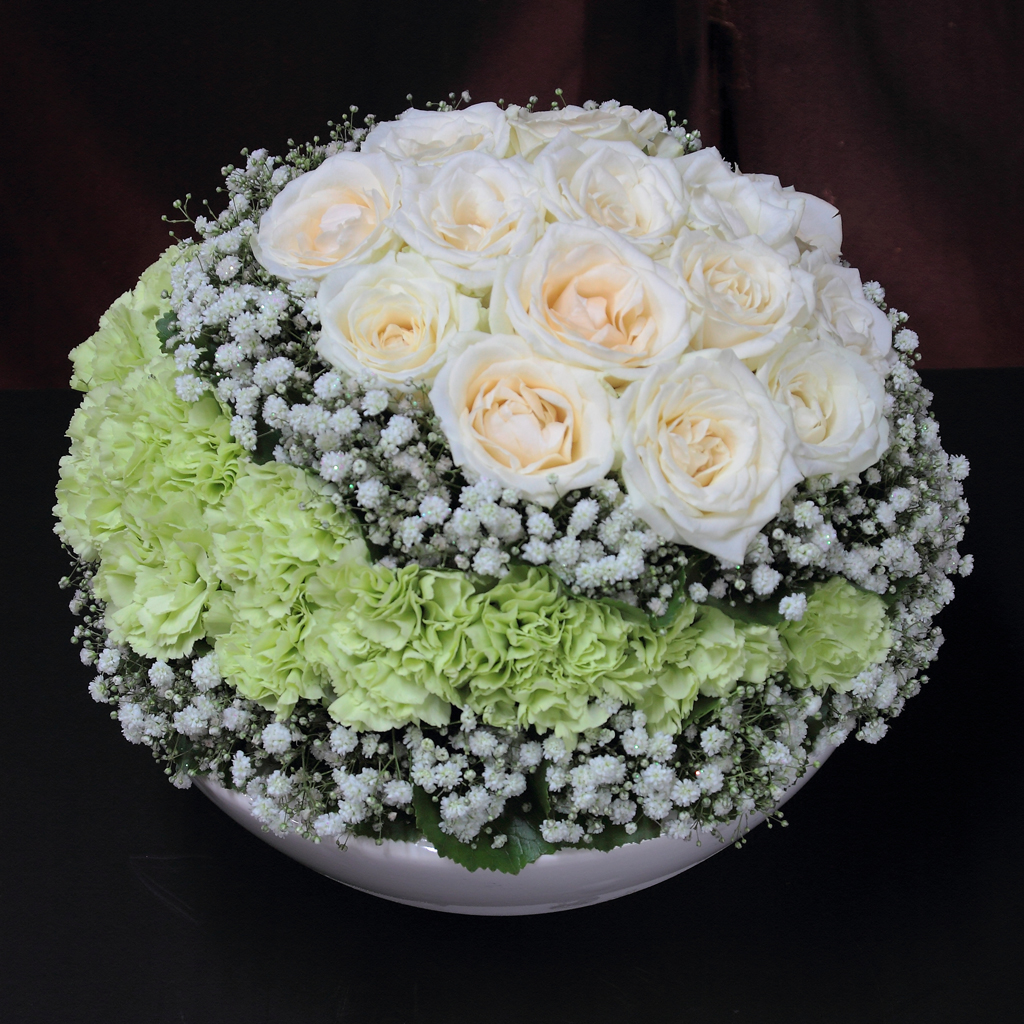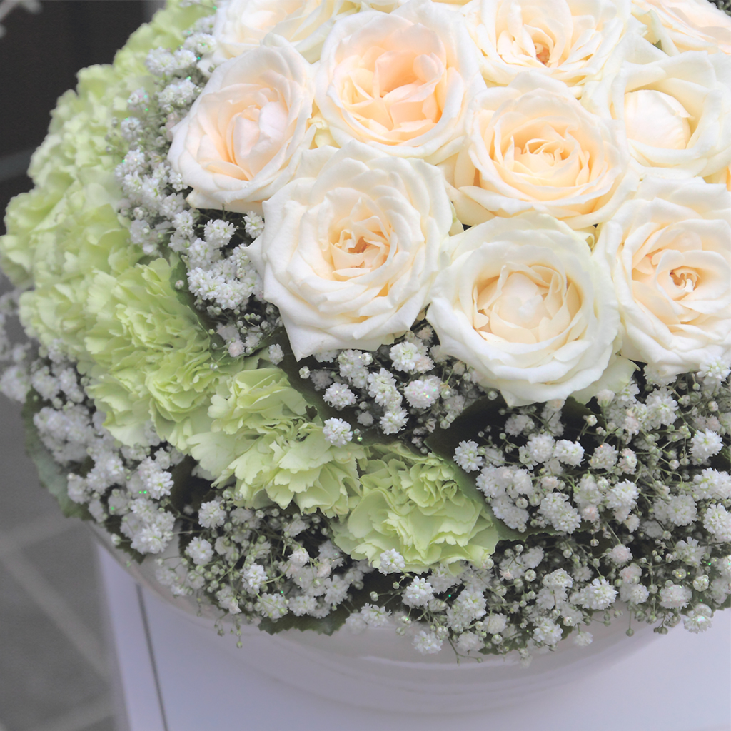 純白のバラを中心に、カスミソウとグリーンのカーネーションを幾重にも層のように重ねた、緻密で気品あふれるアレンジメント。 中心から外側へ向かって描かれる「白と緑の連鎖」は、真っ白な雪原を滑り降りるスキーの轍(シュプール)を思わせる、静謐で美しい躍動感を湛えています。