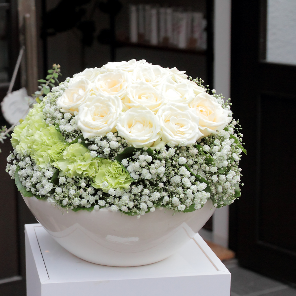 ふわふわとしたカスミソウを花と花の間を丁寧に分かつことで生まれる独特の意匠。 バラ、カスミソウ、そして瑞々しいグリーンのカーネーションが奏でるリズムは、まるで舞い落ちる粉雪が描く軌跡のように、大切な日の空間を凛とした美しさで彩ります。