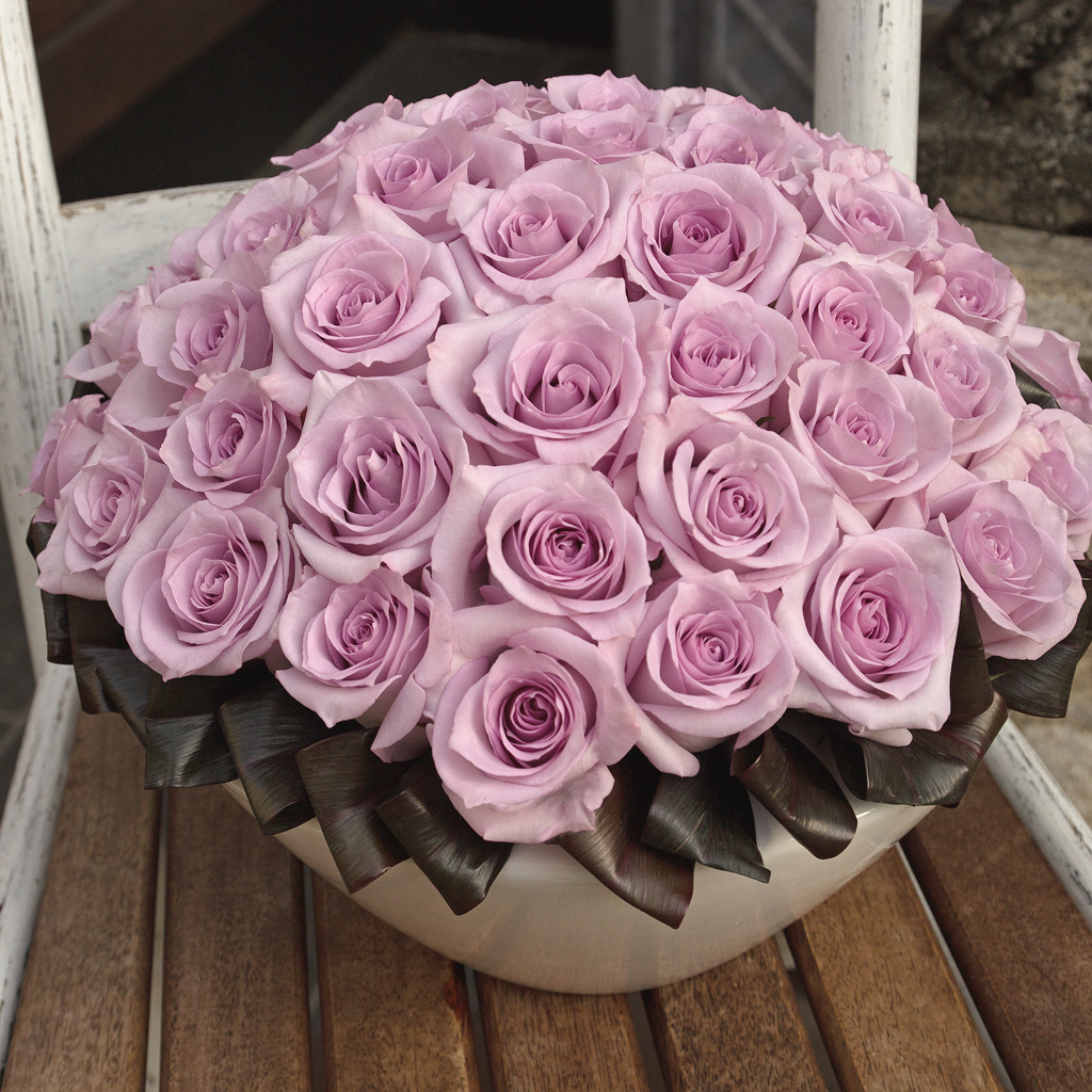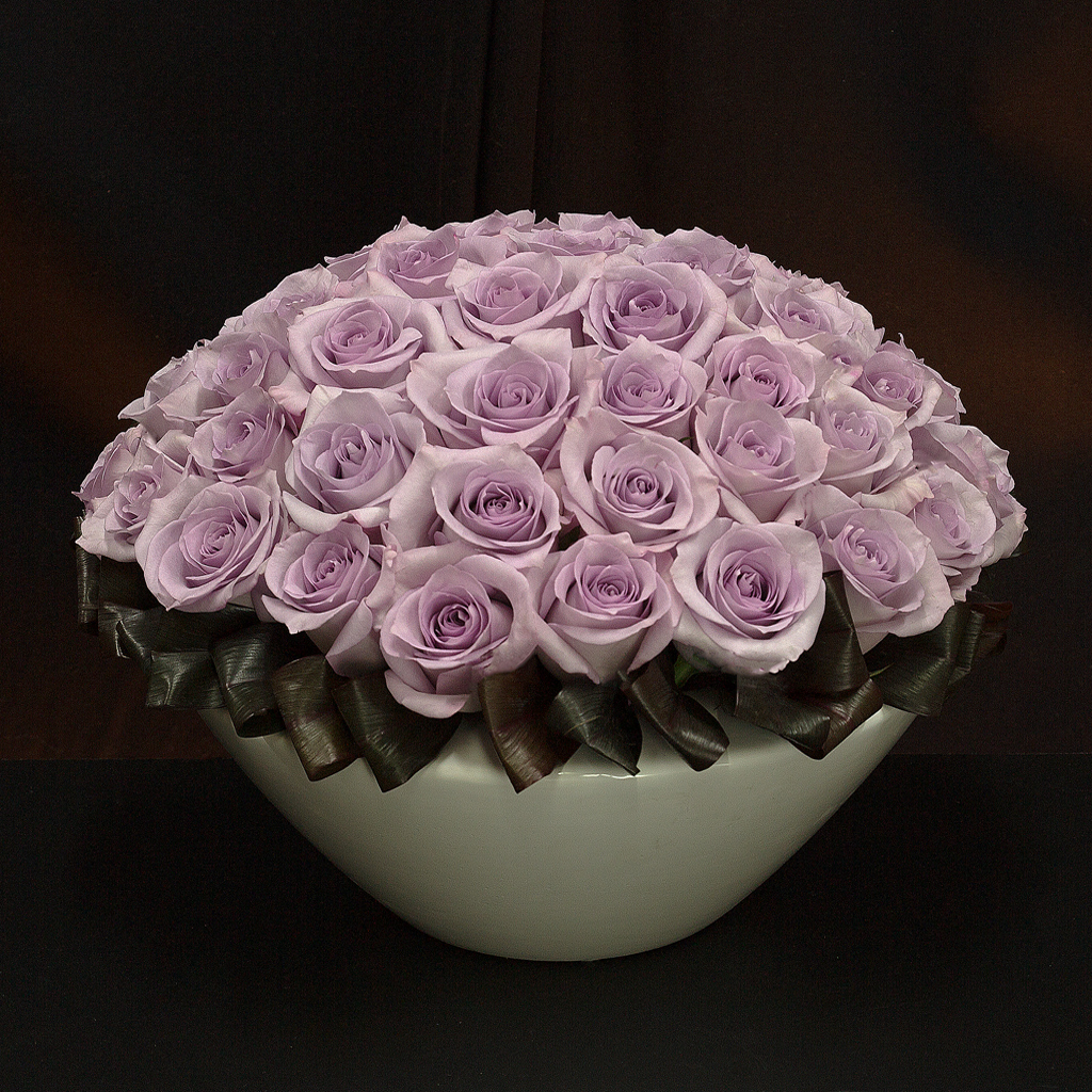 淡いラベンダー色のバラのフラワーアレンジメント。
