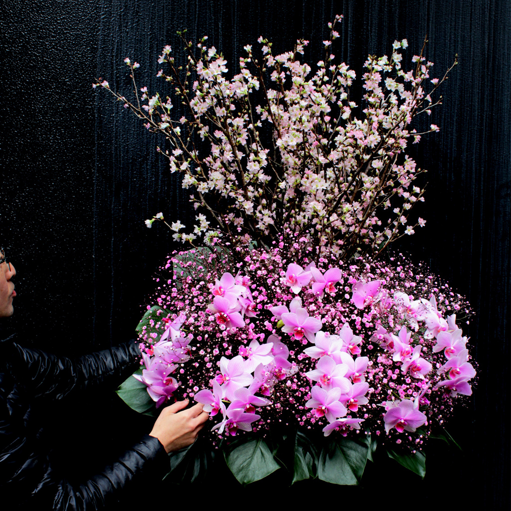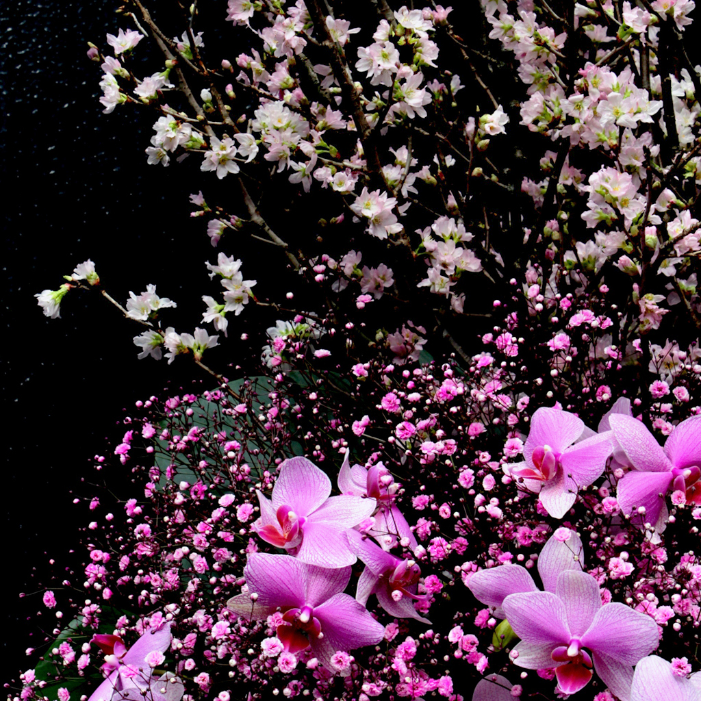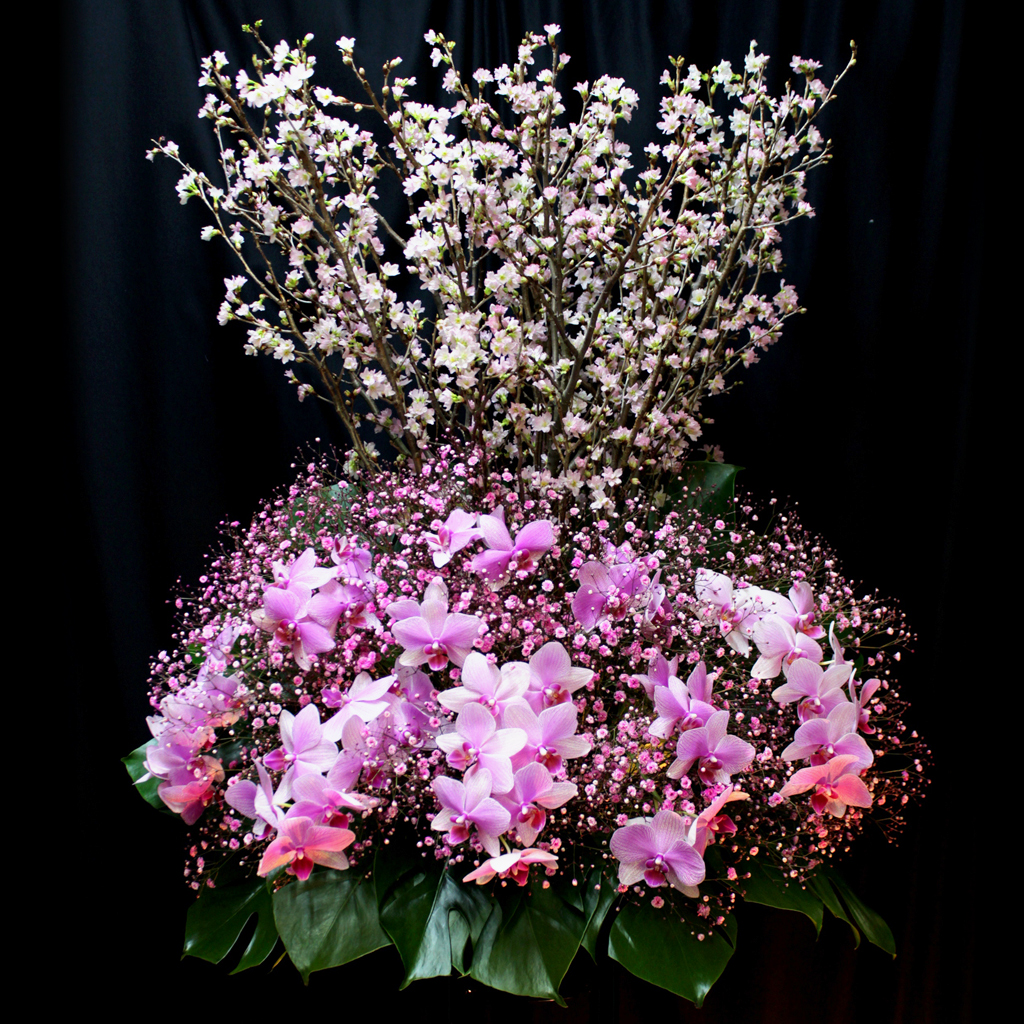 春の風物詩の一つ『桜』。日本の春の代表色でもある淡紅色(タンコウショク)でアレンジしたスタンド花。桜、かすみ草、胡蝶蘭を贅沢に使用し日本の春色を主張します。桜に見劣りしないダイナミックにアレンジした胡蝶蘭が豪華です。
