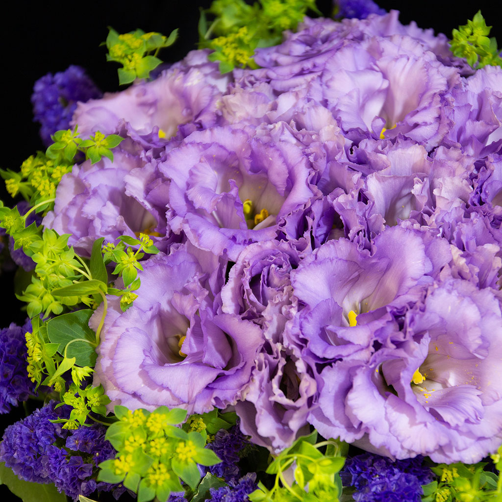 その名の通り、高貴な宝石を思わせるパープルのグラデーションが美しいアレンジメント。 繊細に波打つ花びらが優雅なトルコキキョウと、カサカサとした独特の質感が愛らしいスターチス。 質感の異なる紫の花々を重ね合わせることで、単色では表現しきれない奥行きと神秘的な美しさを生み出しました。