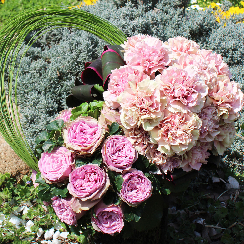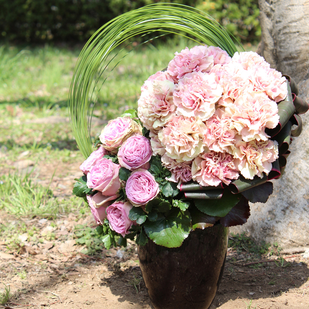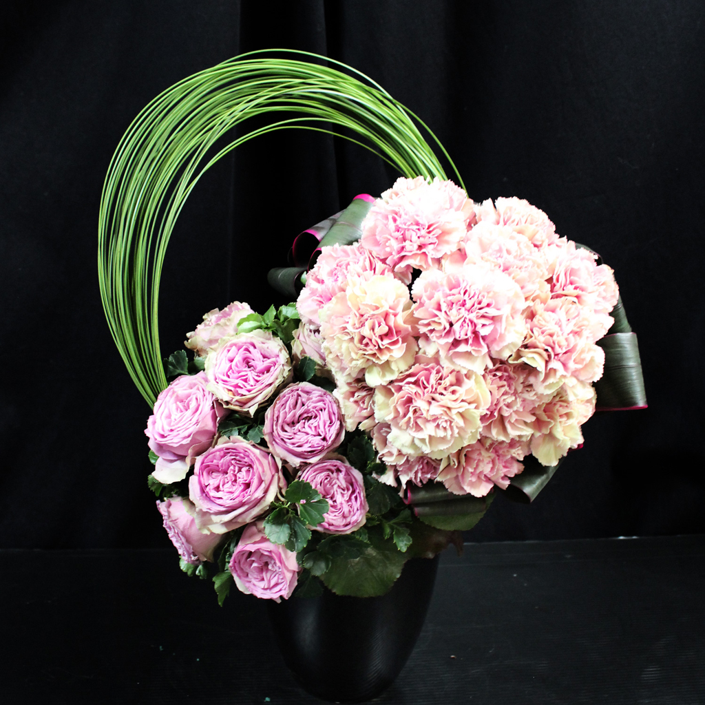 優しい色合いのピンクのカーネーションとバラのアレンジメント。カーネーションとバラのボールアレンジが組み合わさってできているインテリアの様なデザインフラワーです。